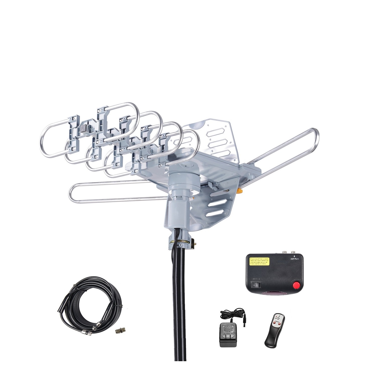 - Infrared Remote Controller -- Built-in 360 degree motor rotor. Built-in Super High Gain and Low Noise Amplifier. Include 40ft outdoor TV antenna Coaxial Cable. Easy for you to place it to get the best receptions.
